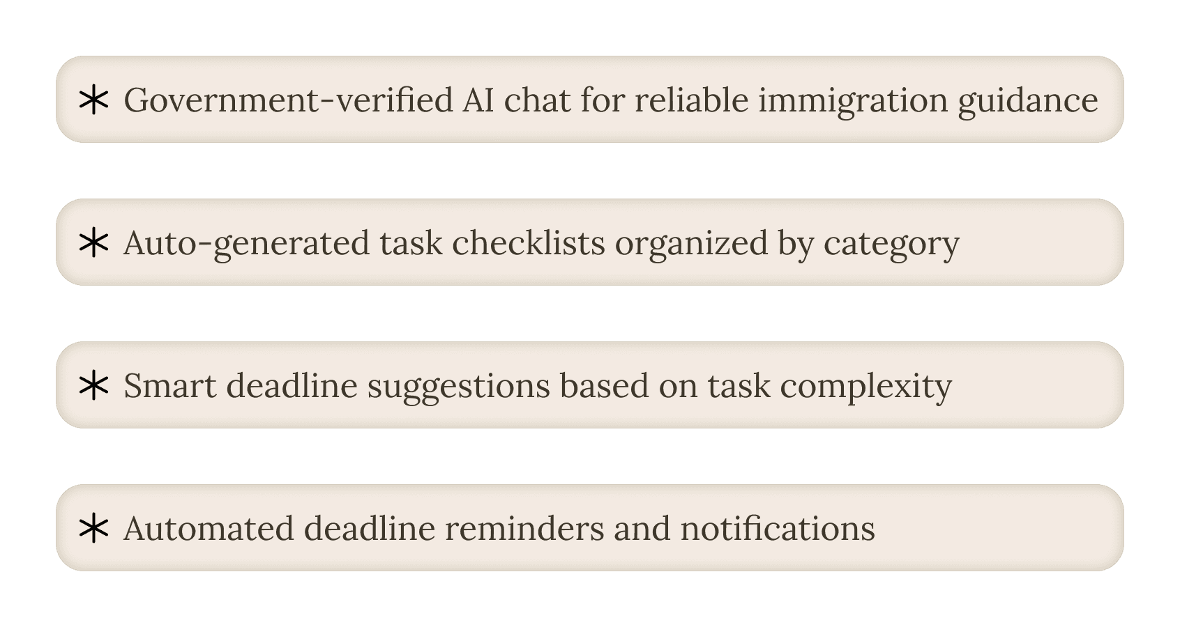After brainstorming ideas with team members, we decided to develop an AI-powered management tool that organizes documents and deadlines in one place, powered by a chatbot that provides accurate, updated immigration guidance.